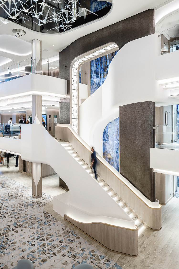 The space is a symphony of organic, curved lines and overlapping planes. The art wall flanking the stair suggests nautical navigation, while the ceiling piece feels like twinkling constellations. The architecture is unabashedly modern as if the space were a sign of what a cruise will look and feel like in the future.
