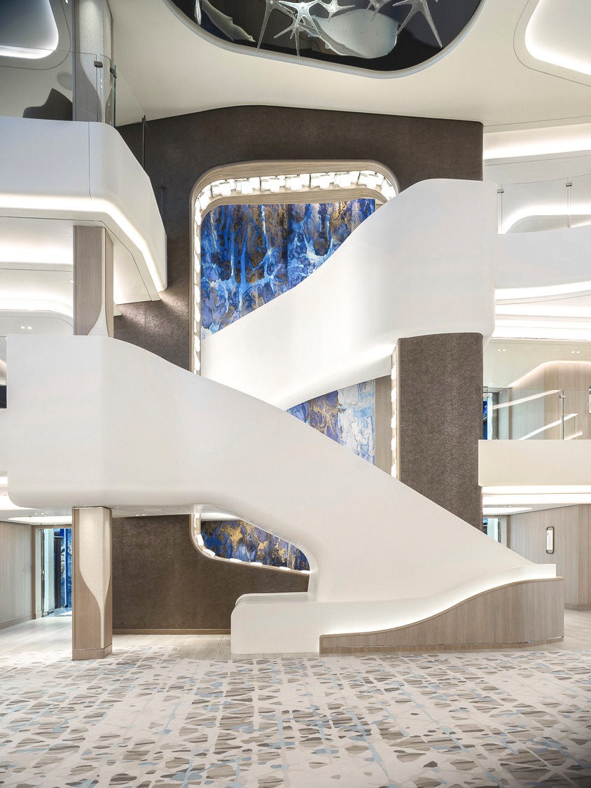 The atrium is a three-level (decks 6, 7 and 8), an interconnected node within the ship. The architecture is unabashedly modern, almost futuristic, and relies on a series of flowing, organic shapes that draw the eye in and around the space. Like some of the famous locations mentioned above, there is a dramatic sense of arrival as the circulation moves in and out of the main space but also passes through a textured portal and grand stair. The portal, which encases a piece of custom art reminiscent of a nautical chart, helps orient guests and defines the scale of the space.