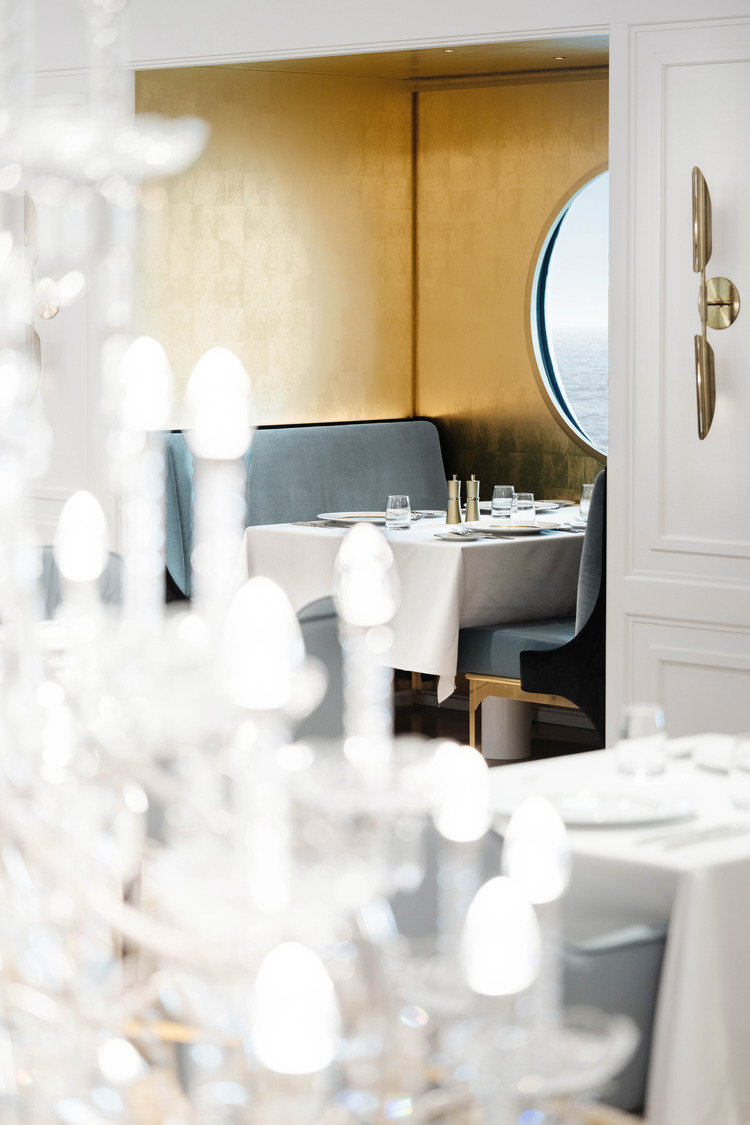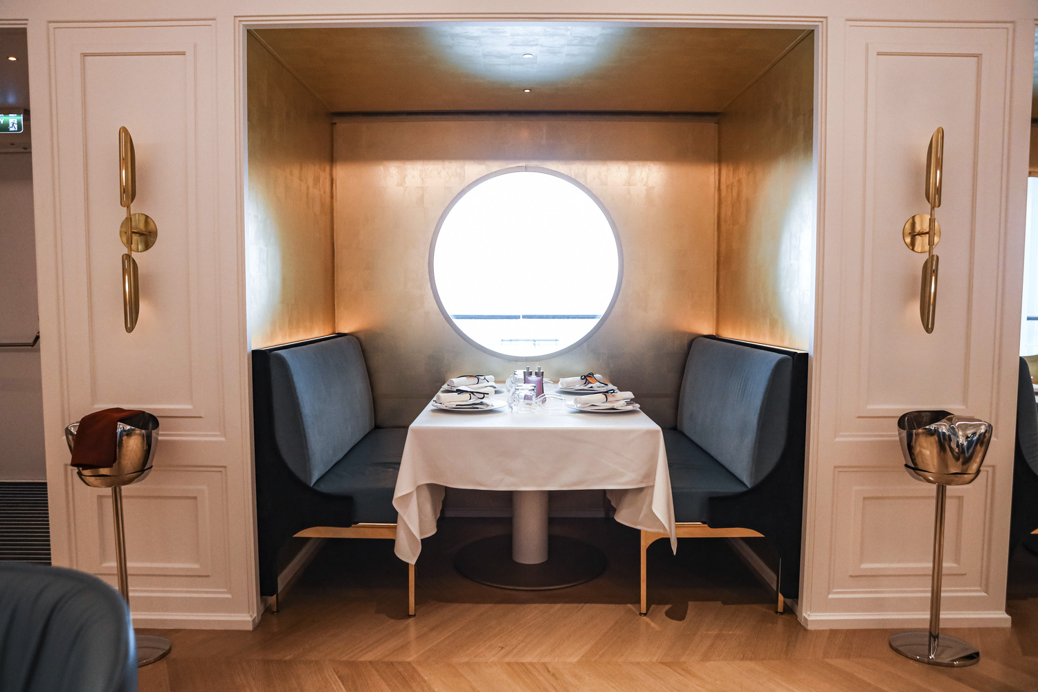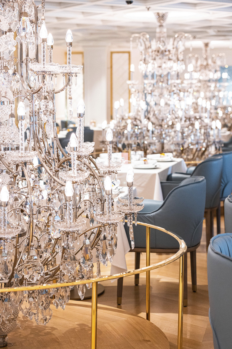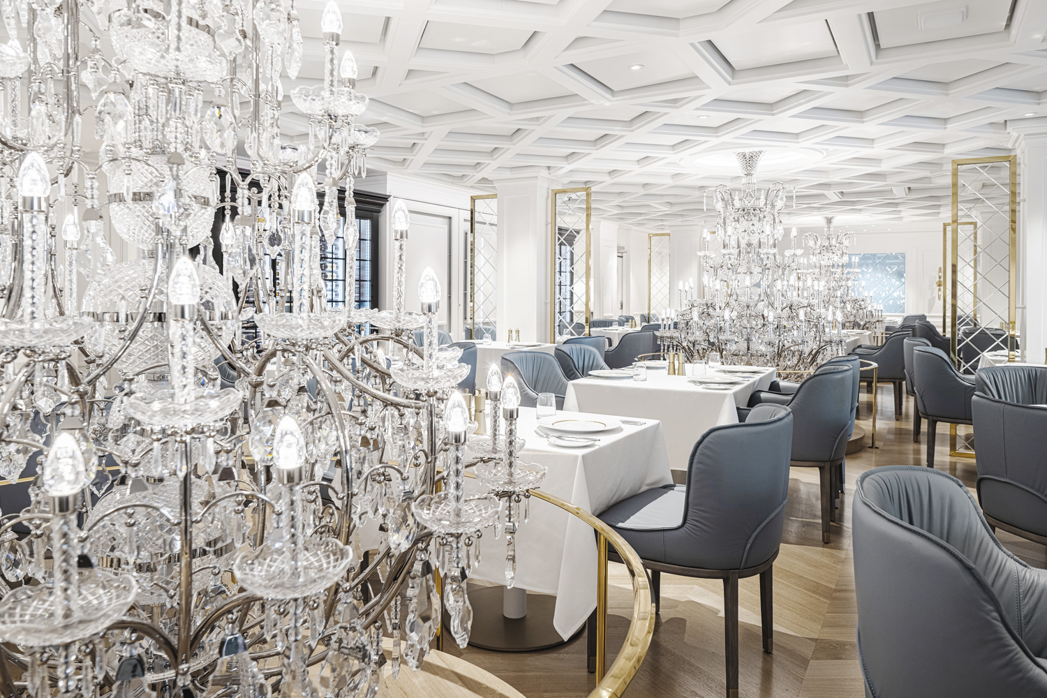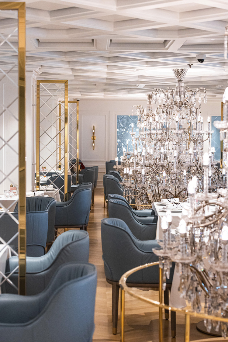 Coffered ceilings and plaster moldings create a counterpoint to the modern furniture and parquet flooring, hinting at the emblematic Hall of Mirrors in the grand Palace of Versailles. Gold-leaf dining alcoves offer a slightly more secluded dining experience, featuring a golden and neutral palette with plush blue accents that give a nod to the sun king himself.