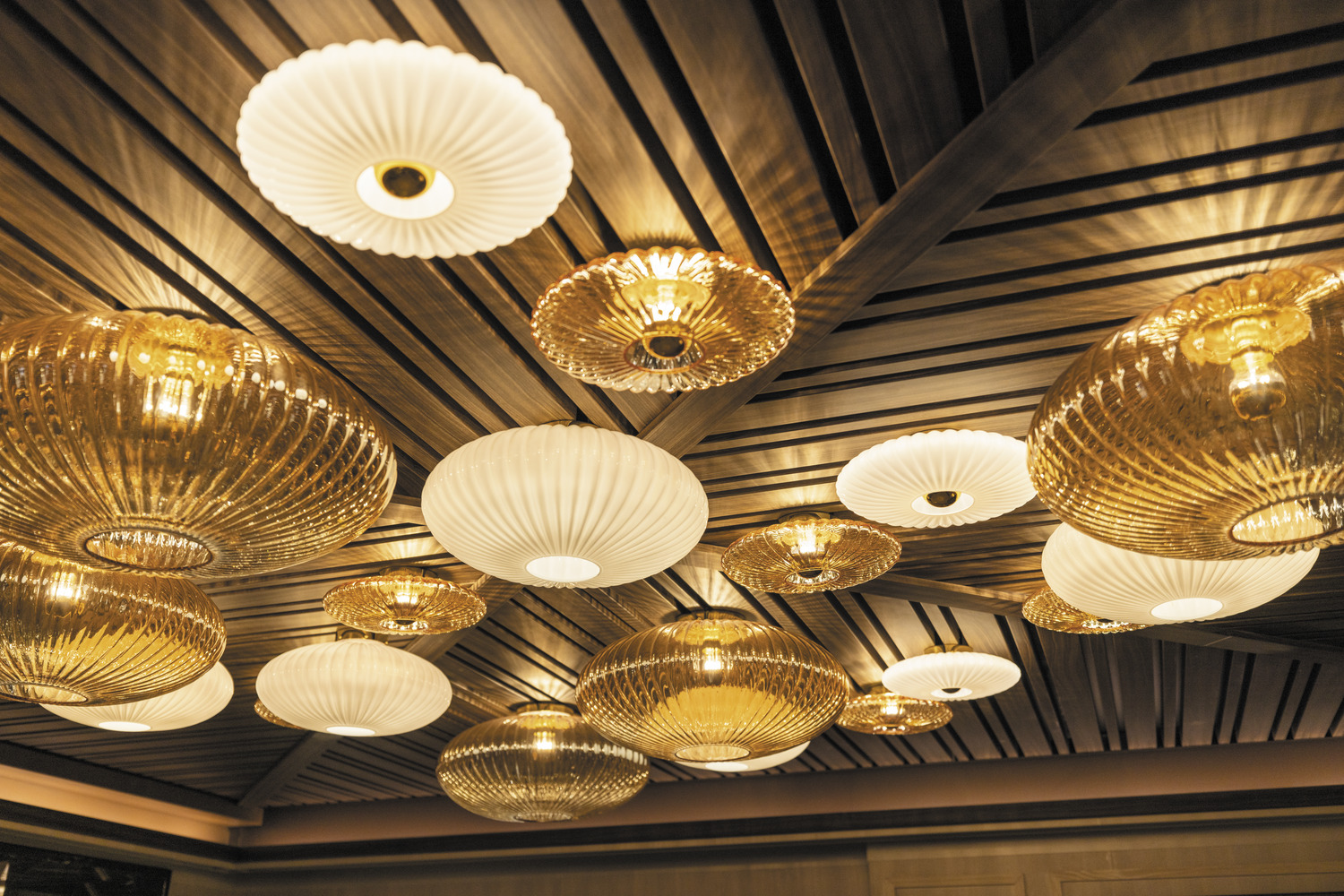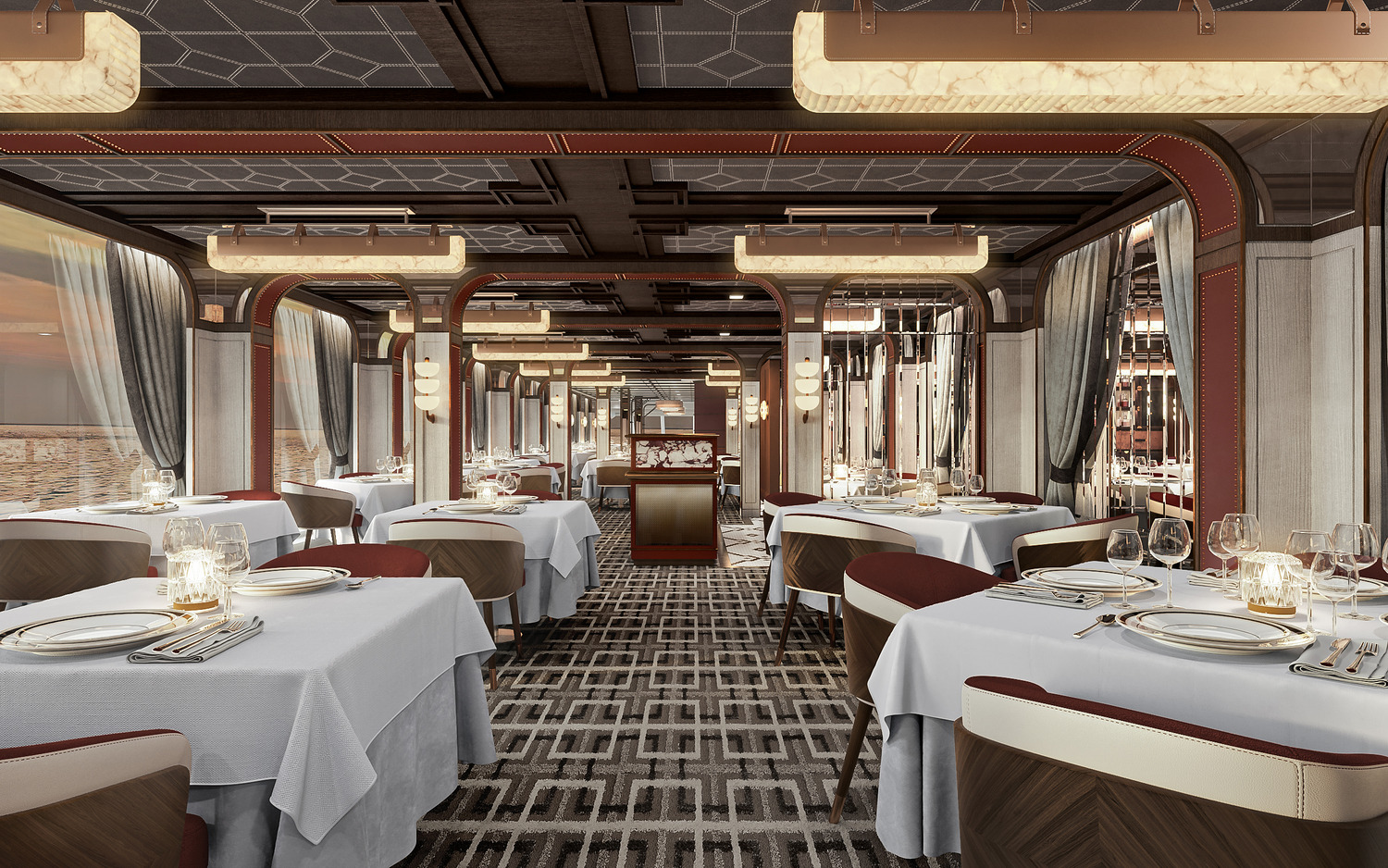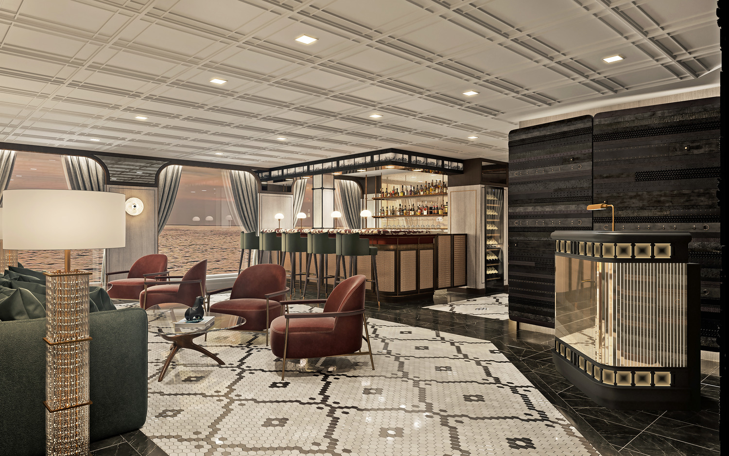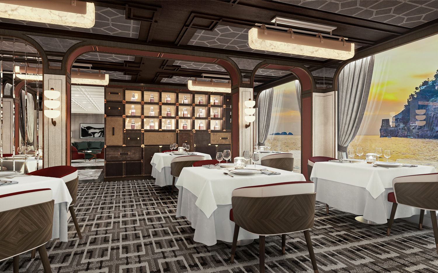 Studio DADO designed Prime 7 to embody the daily journey of a gentleman in turn-of-the-century New York. Starting in the vestibule area, leather luggage and black-and-white photography draw guests into the story. The entrance showcases details that recall a streetcar from the early 1900s, with wall detailing that looks like gentleman’s belting leather and a glass, lenticular screen above the bar that shows the growth of New York from the 19th century to present day. Moving through the restaurant, the aesthetic changes to feel more residential—Persian carpets, residential-style lighting, and memorabilia in vitrines that disguise server stations and back-of-house areas. Every element, from the stitched ceilings to the whiskey decanters to the fashion-inspired furniture, was hand-selected to transport guests to a time gone by.