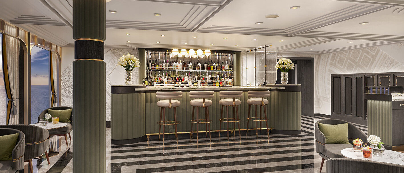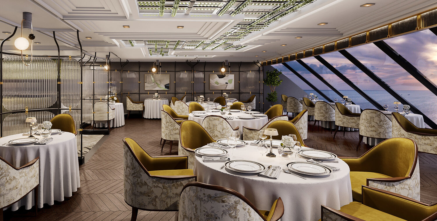 Just as Paris is a place of contrasts—a bustling capital city by day and a romantic city of lights by night—Chartreuse embraces harmonious contradictions. In the entrance, the camelia flower, a signature bloom of Coco Chanel herself, sets off a leather interior with glittering gold detailing around the edges. The bar, wrapped in leather with a marble top, and Art Deco-inspired lighting fit perfectly with the 1930s Paris aesthetic. An undulating, ombre wall leads diners deeper into the space and follows the lines of the River Seine. The final room evokes the Art Noveau style of the Paris Metro.