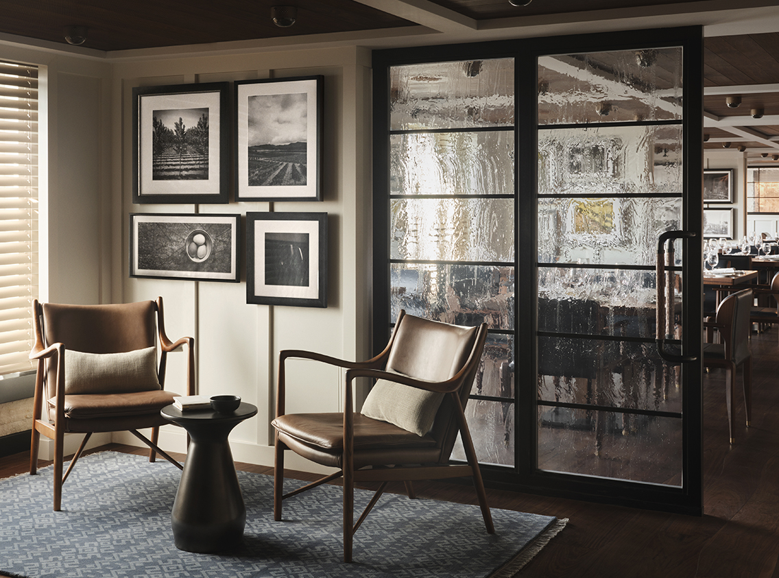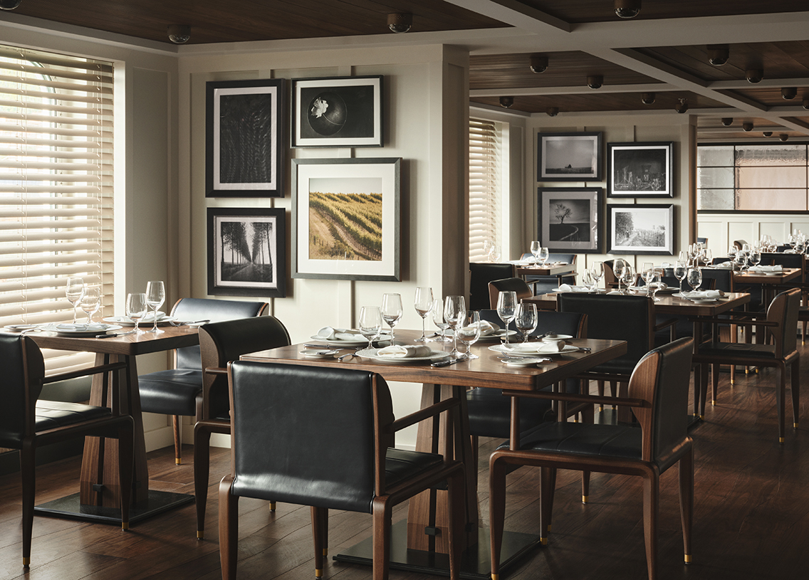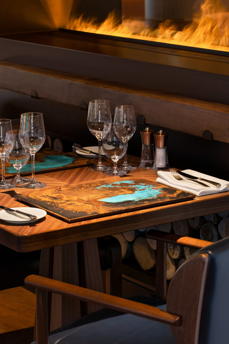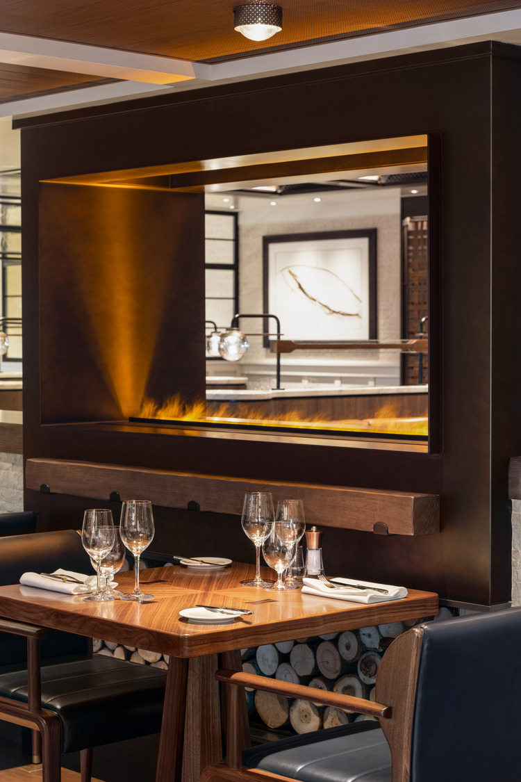 A central fireplace serves as a quiet focal point, offering guests a place to gather, pause, and connect. The fire evokes the restaurant’s name and introduces a soft glow that enhances the layered ambiance. As guests move through the space, they encounter subtle shifts in light, material, and mood, each designed to support the relaxed conviviality that defines California’s wine regions. The result is a dining experience that feels thoughtfully composed yet completely natural.