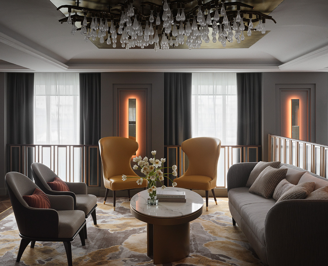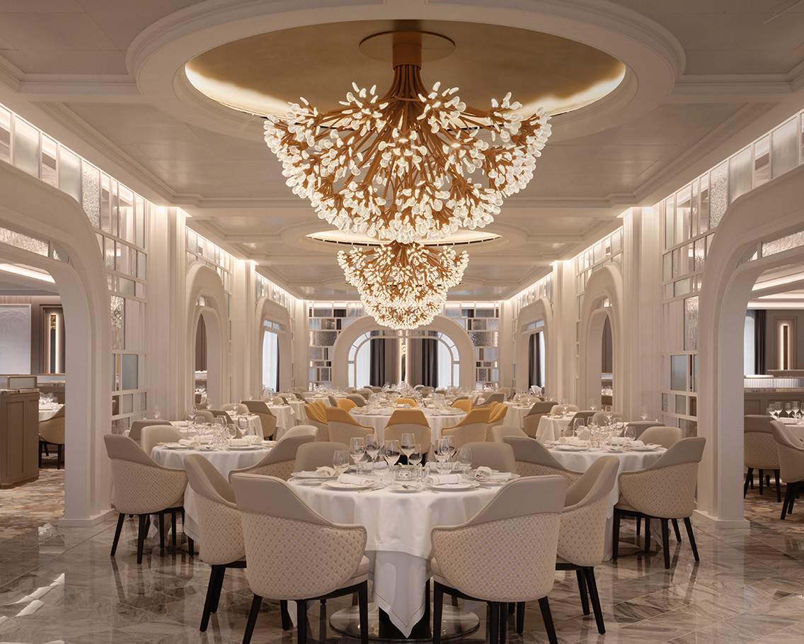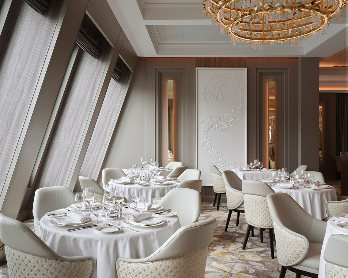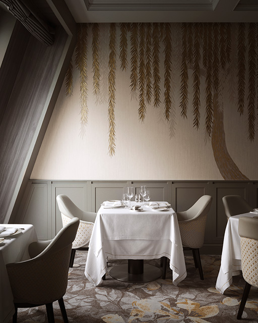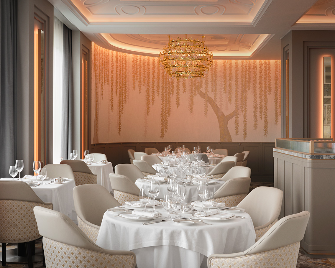 Stepping into the Grand Dining Room feels like entering a living garden under glass. DADO imagined the space as both regal and restorative, drawing inspiration from Europe’s great conservatories. Hand-painted wallcoverings and parquet floors create the illusion of dining beneath willow branches, while immense hydrangea chandeliers bloom overhead. Light filters through the glass centerpiece, casting patterns that change with the day. It is a space where grandeur feels natural, and every meal carries the ease of dining outdoors in perfect weather.