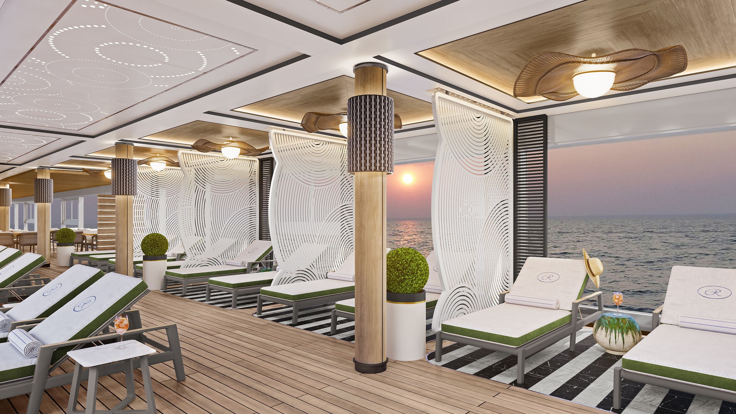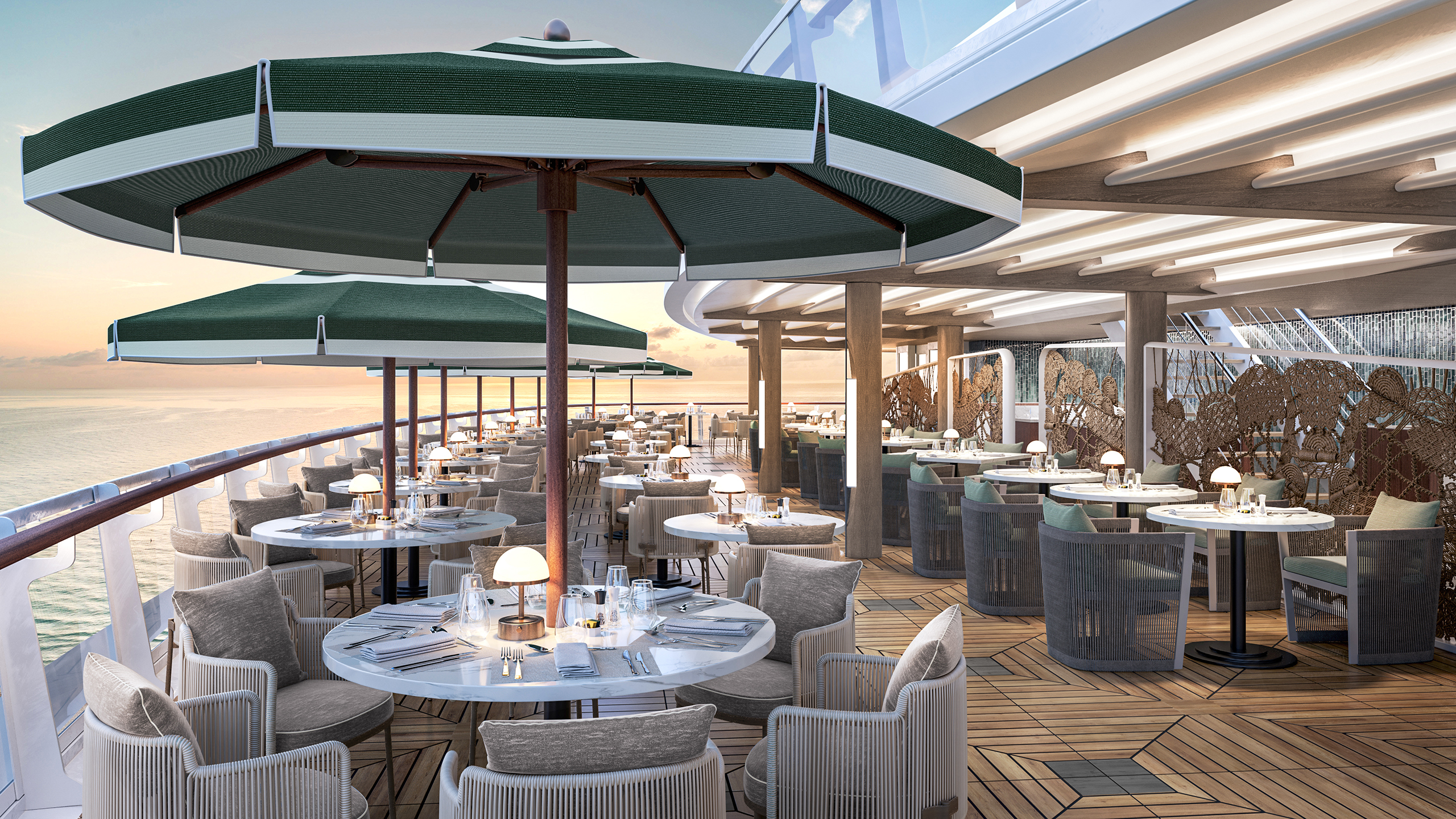 Outfitted in teak accents, Grandeur’s pool deck is one of the most elegant at sea, featuring a lavish pool and two whirlpools—the perfect retreat for relaxation and rejuvenation. Guests can unwind in the warm, soothing waters while enjoying unforgettable views and meticulous services.