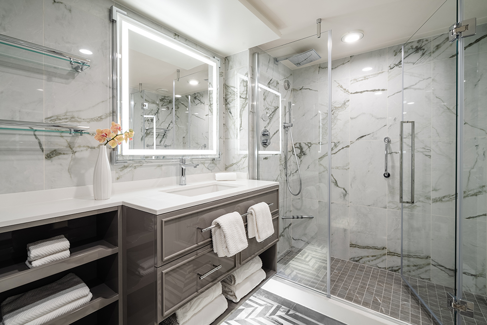 The bathroom was reconfigured to maximize comfort, with oversized showers, porcelain finishes, and generous vanities. These thoughtful updates create a suite that matches the elegance of a fine hotel while offering the ease of home.
