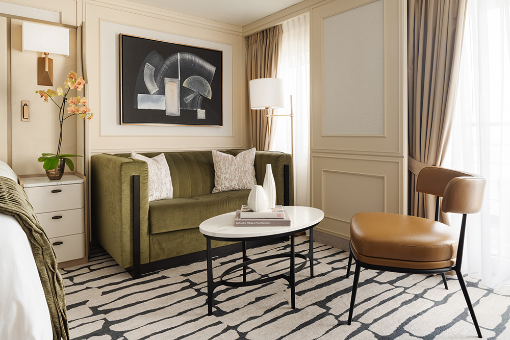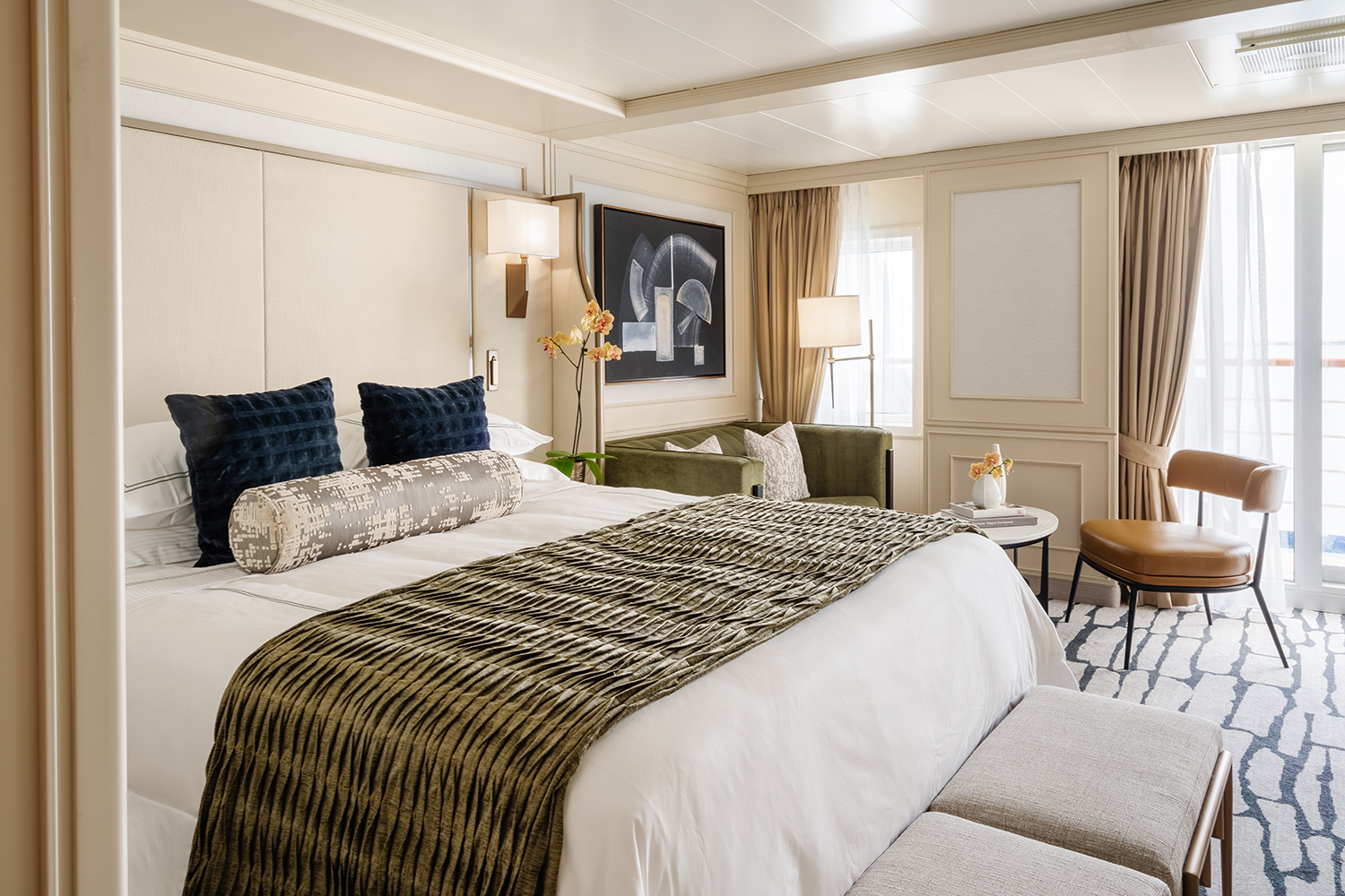 The Oceania Cruises Riviera Penthouse Suites feel brighter and more open thanks to Studio DADO’s reimagined layout that removes barriers between the living and sleeping areas. Natural tones anchor the space, while a mix of velvet, leather, and polished wood adds texture and contrast.