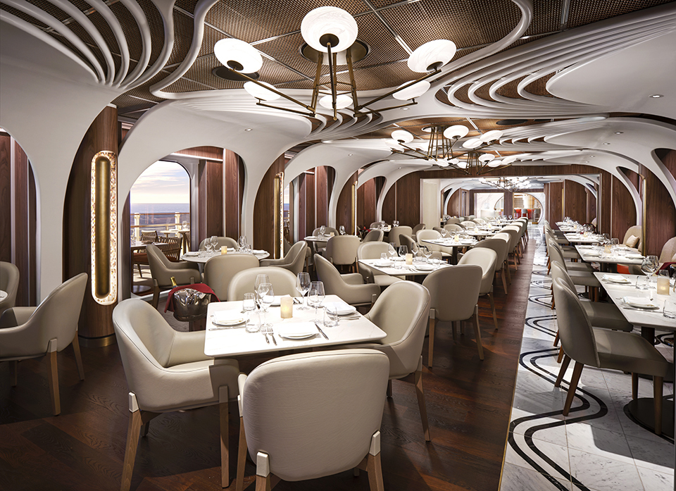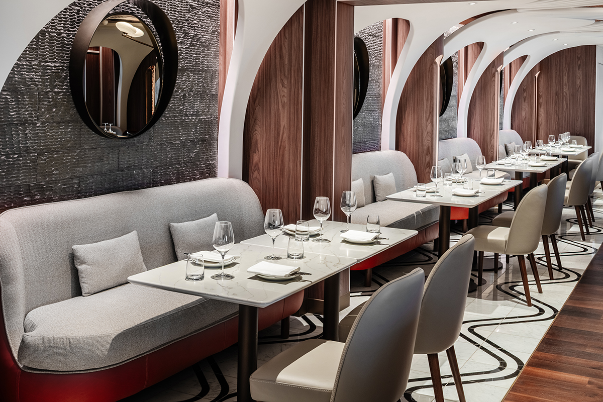 Bringing the beloved Italian restaurant brand Onda by Scarpetta to life on the high seas aboard Norwegian Cruise Lines Prima (and sister ship Viva) meant reimagining familiar feelings of place, taste, and togetherness for an entirely new context. DADO designed the space to be a rich sensory experience rooted in architectural gestures and material choices that celebrate connection and contrast. Walnut and Calacatta Gold marble ground the space in natural warmth, while a layout shaped around community encourages spontaneous moments of conversation and shared discovery. The atmosphere feels both intimate and expansive, refined yet relaxed, where contemporary Italian design meets the vibrant pulse of a Manhattan evening.