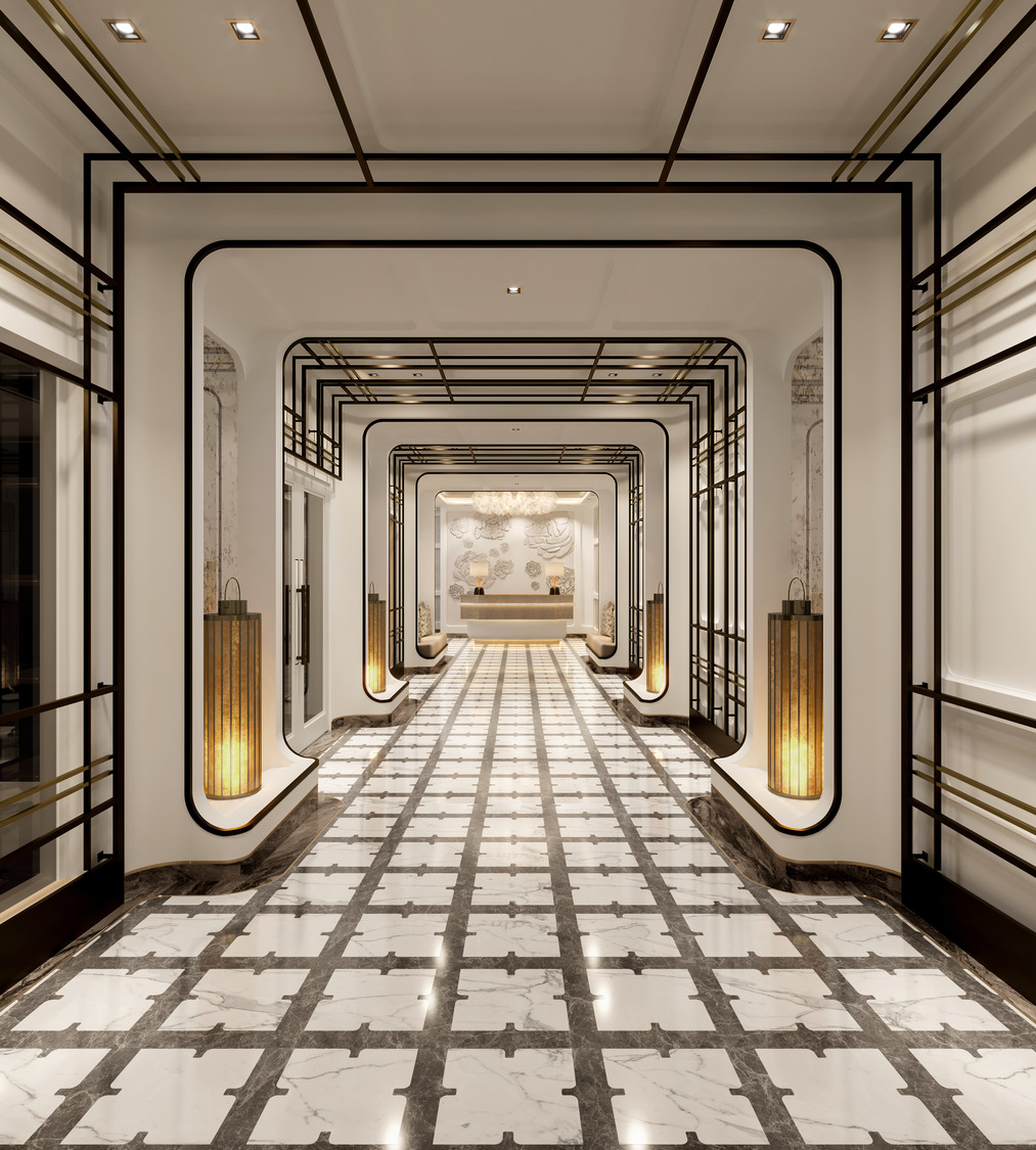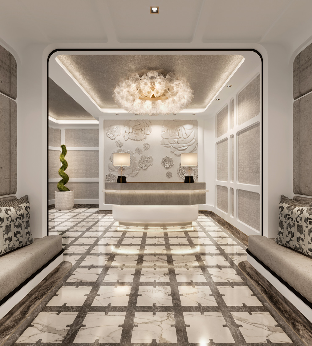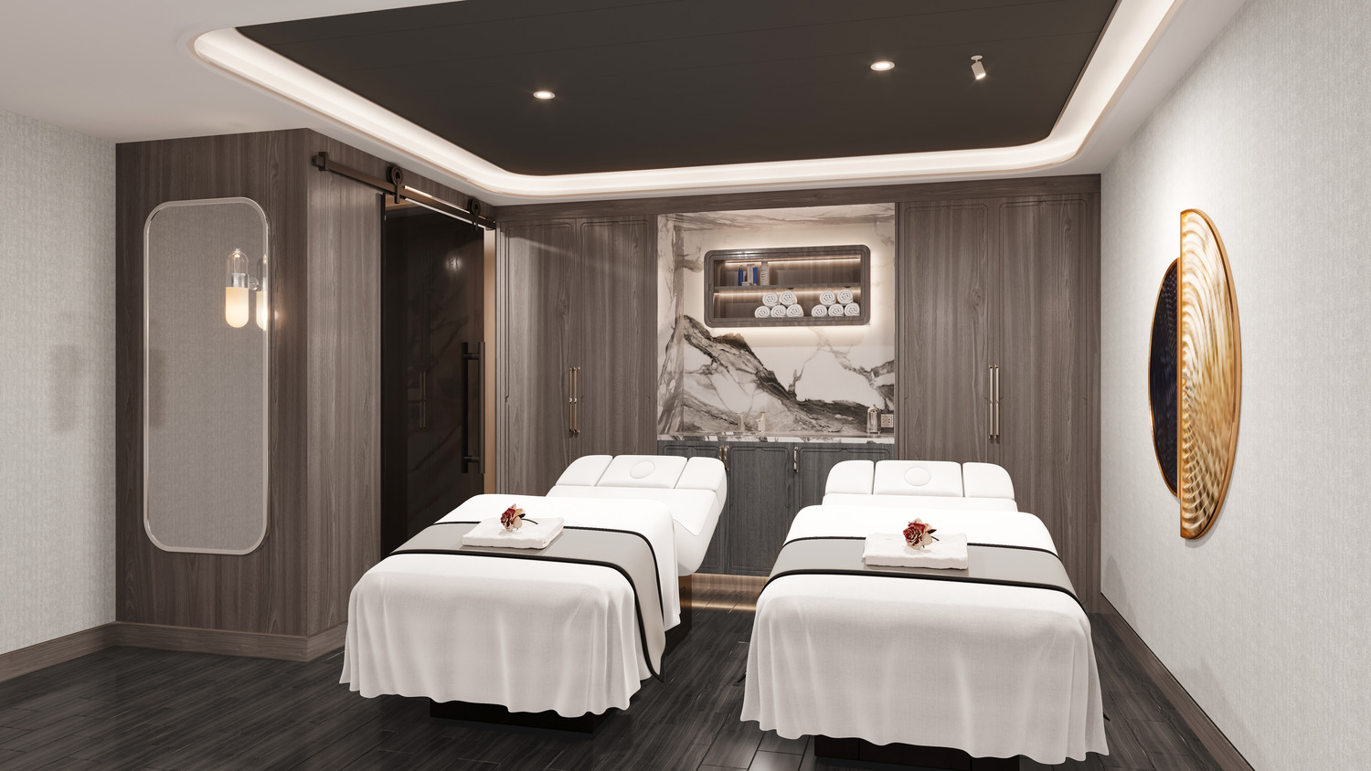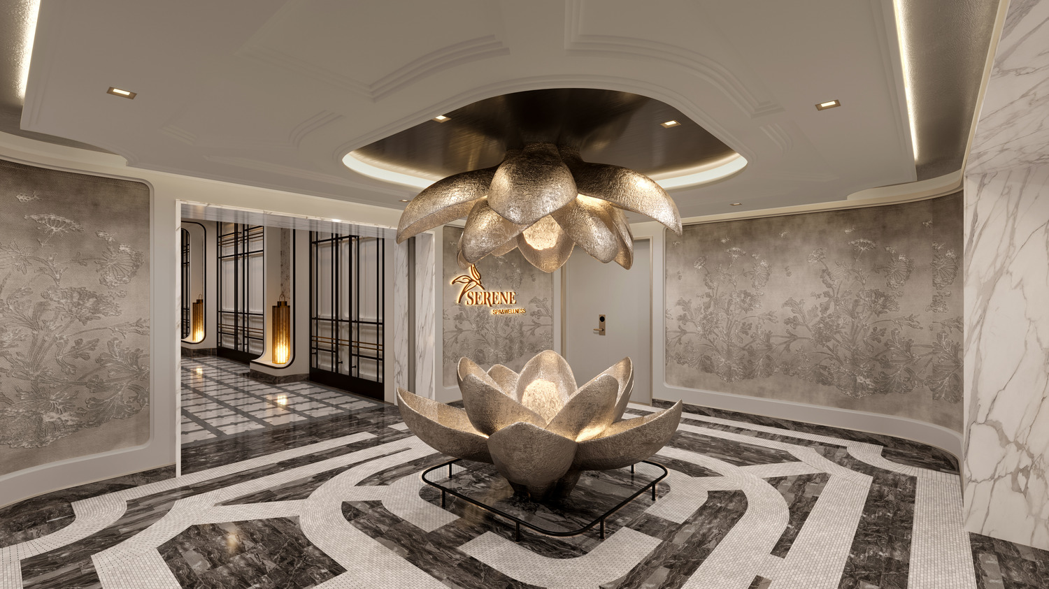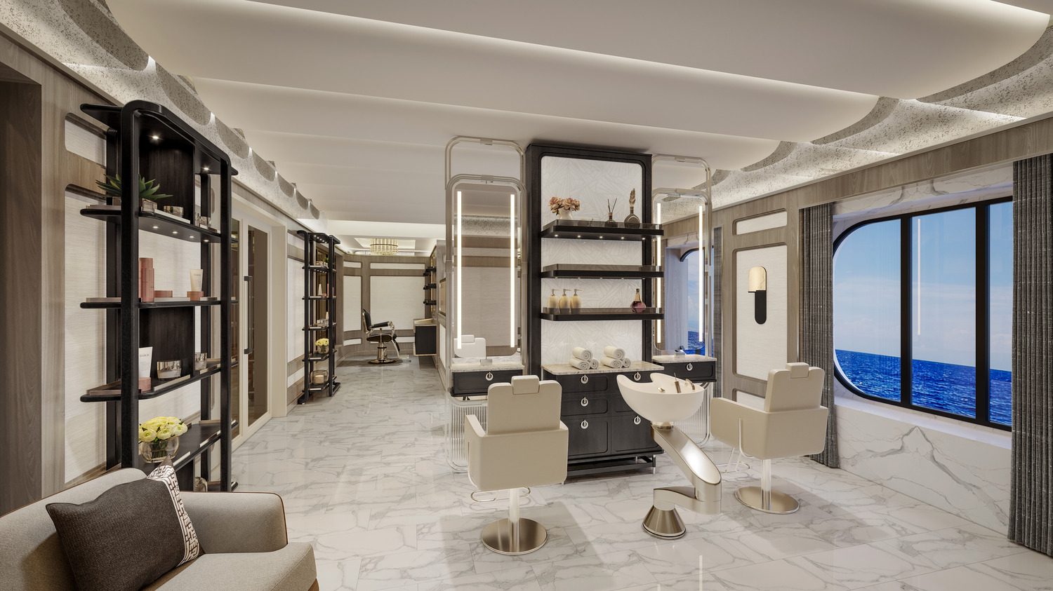 In Seven Seas Grandeur’s spa, the floral motif carries through the space, offering a visual reminder of rebirth and rejuvenation. The corridor leading to the reception desk is a processional experience, filled with architectural details like articulated metal canopies and lantern niches that set the scene. In the salon, a scalloped effect echoes the sea without relying on a heavy-handed theme. The treatment rooms have a rich and inviting look that feels like a cocoon while the relaxation room offers a sense of privacy and enchantment, as though guests are inside a topiary maze. Outside, three Jacuzzis and a lounge area offer private views of the sea in a warm, welcoming space that is the perfect counterpoint to the fresh sea air.