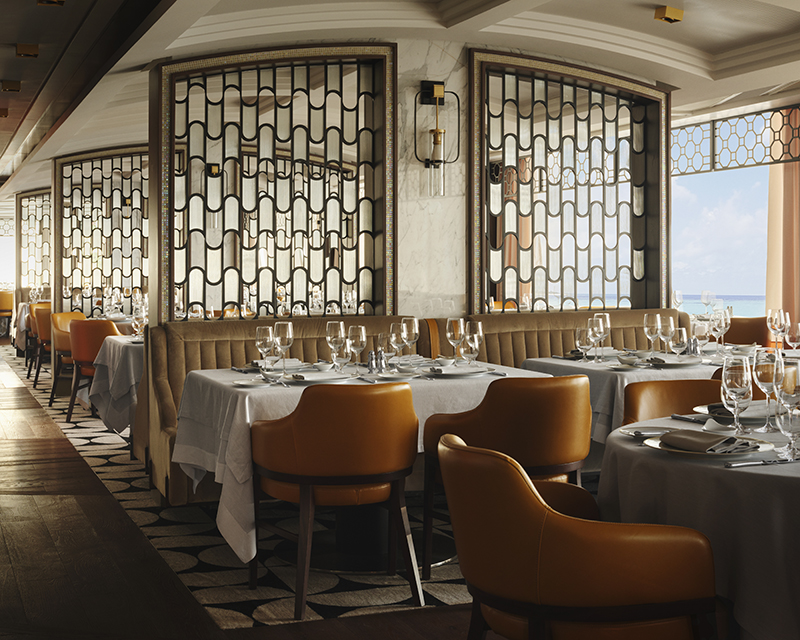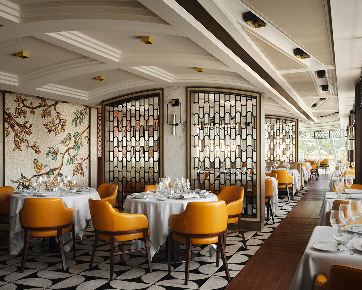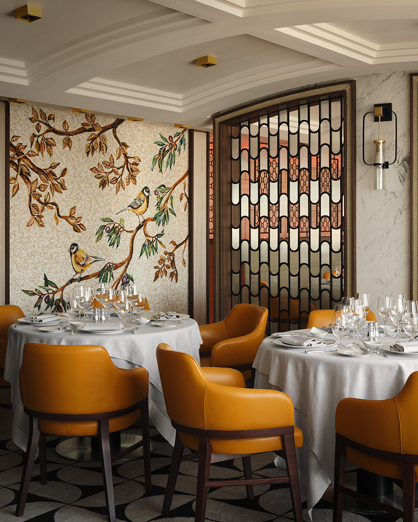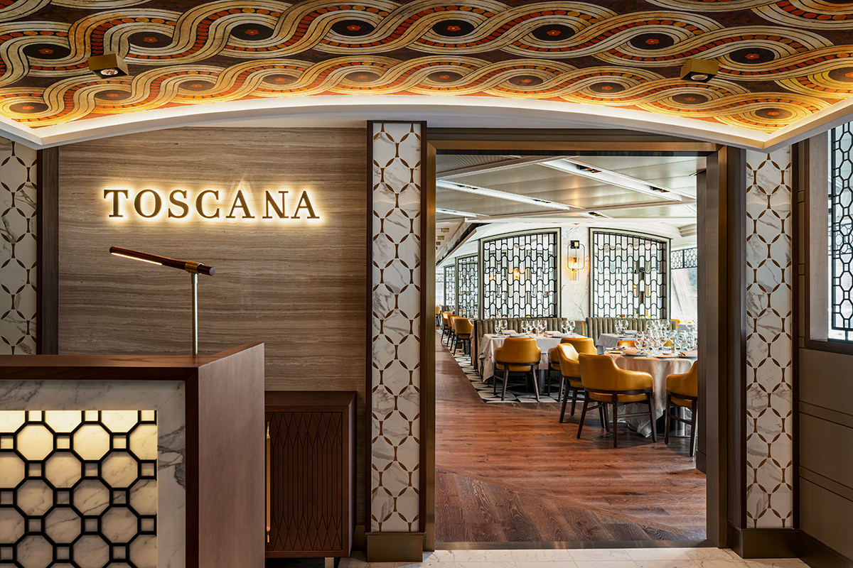 Studio DADO designed Toscana with layered motifs that combine the contemporary and traditional. It’s a unique marriage of styles found in Medieval European cities like Siena, Italy. The venue’s main ceiling is a modern interpretation of temple frescoes, while the private dining room features a hand-painted ceiling above vitrines showcasing museum-style sculptures. The walls integrate upholstery and marble to balance sophistication with warm familiarity.
