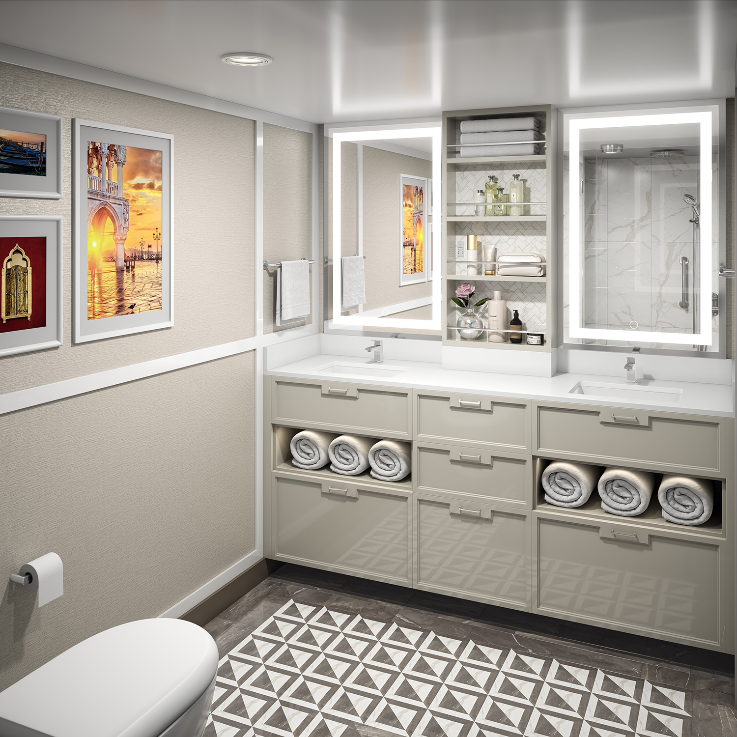 Details bring the suite to life: mosaic Italian tiles in the shower, backlit mirrors that brighten the bath, and a spacious living area designed for effortless conversation. The result is a space that feels polished, practical, and inviting all at once.