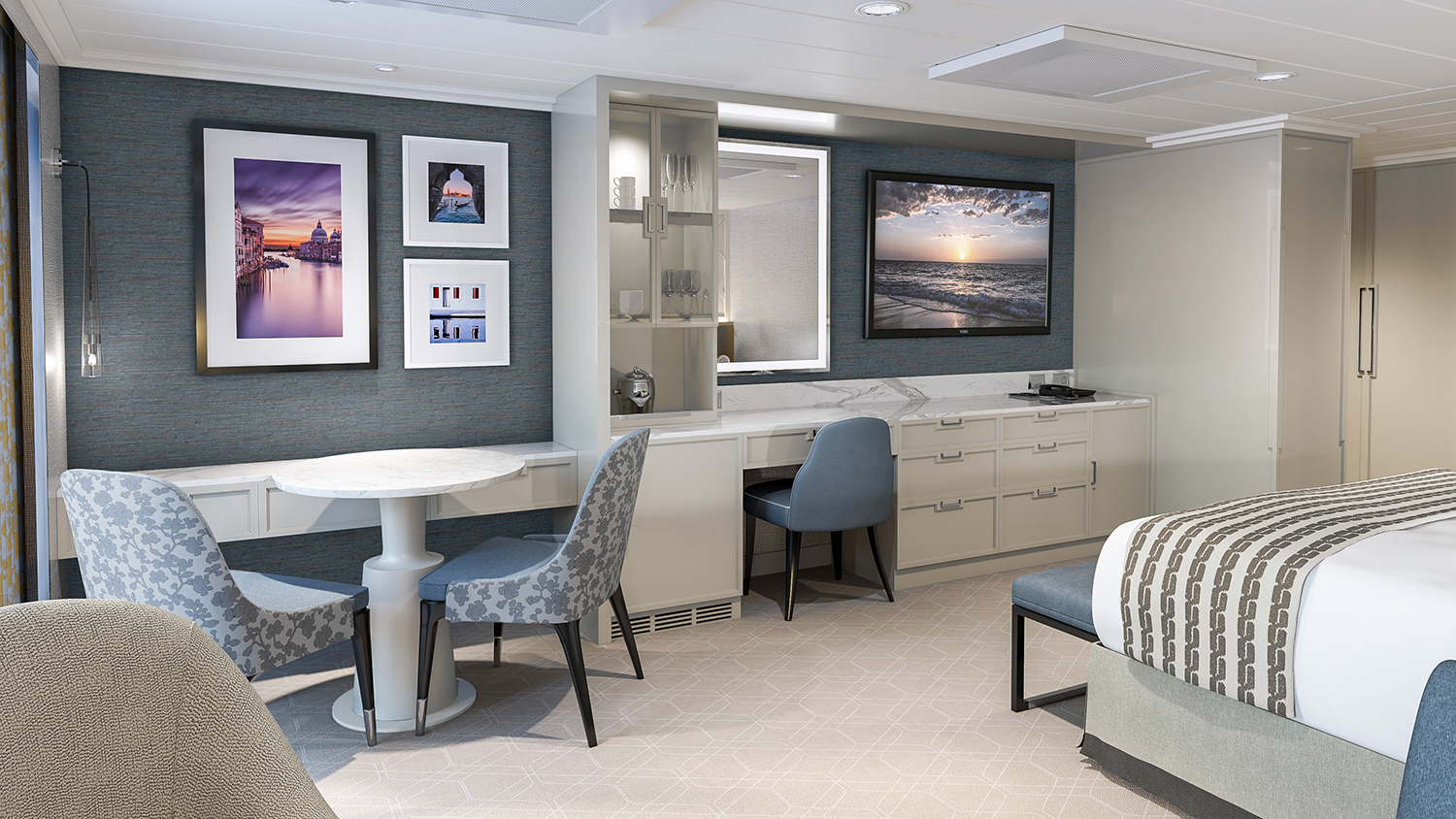 The Vista Penthouse Suite welcomes guests with natural light and a palette that recalls the shifting blues of the horizon. Neutral tones and slate accents create an immediate sense of calm, while the open plan makes it easy to settle in and feel at home. The built-in refreshment area doubles as a workstation, giving the suite flexibility for both leisure and focus.